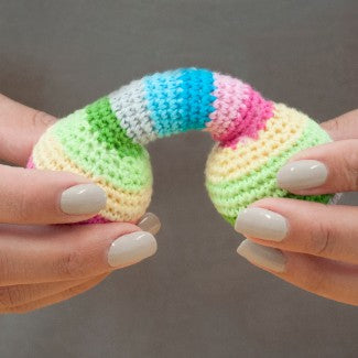 Easy to hold, gum and chew—Slim design and dumbbell shape is easy for little hands to grasp and crocheted, textured and sturdy material is soft and pliable for teething babies.